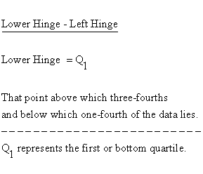 [Home] [Up] [Box Plot Overview] [Hinge Spread] [Interquartile Range] [Interquartile Difference] [Upper Hinge] [Lower Whisker] [Upper Whisker] [Lower Inner Fence] [Upper Inner Fence] [Outliers] [Extremes] [Upper Outer Fence] [Lower Outer Fence] [Non-Outlier Range] [Lower Outermost Value] [Upper Outermost Value] [Lower Hinge]